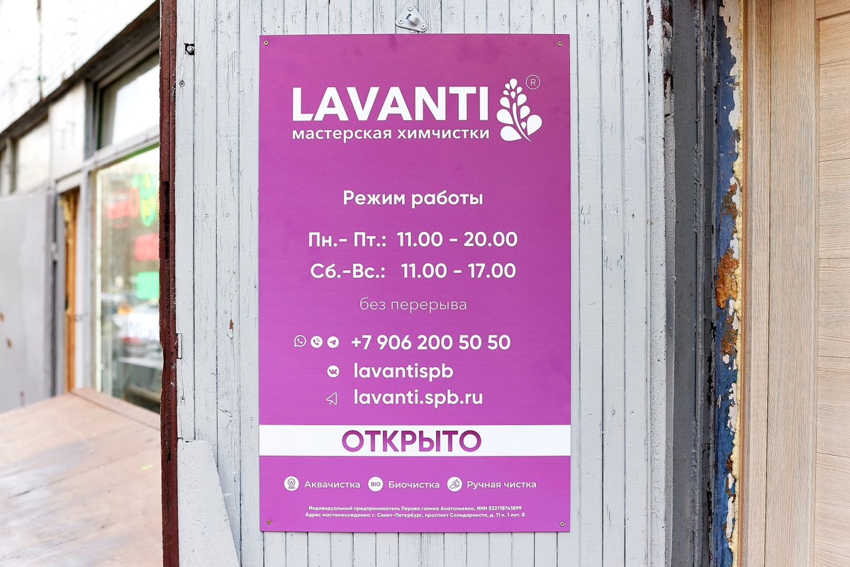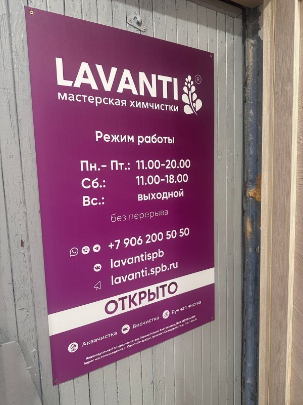 Найти организацию можно по адресу Ленинградская область, Всеволожский район, Заневское городское поселение, Кудрово, Областная улица, 1. Химчистка Lavanti работает рядом со станцией метро Улица Дыбенко. Химчистка работает с Пн-пт: 11:00 - 20:00; сб-вс: 11:00 - 17:00.